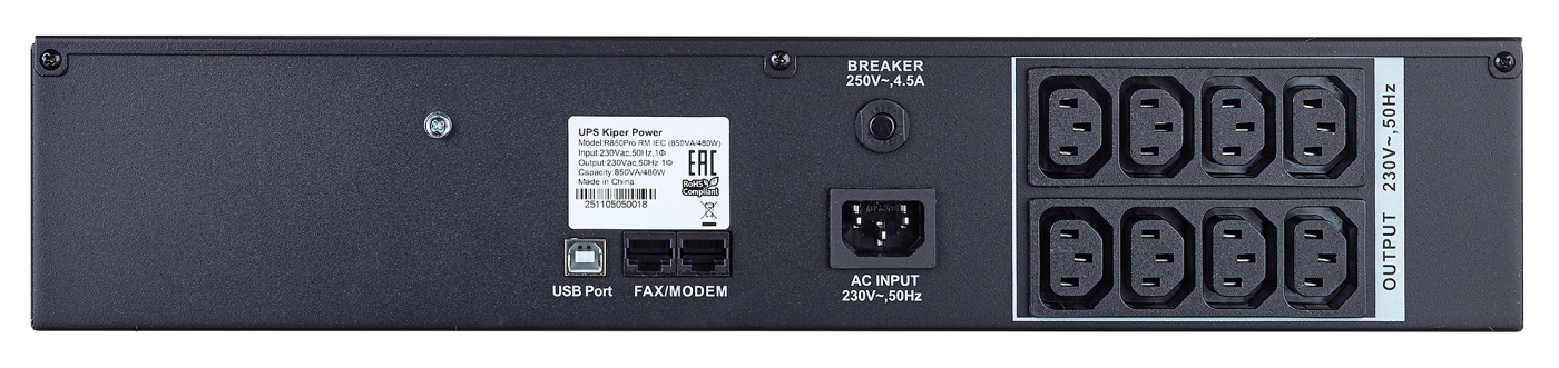 Источник бесперебойного питания Kiper Power R850Pro RM IEC (850ВА/480Вт.), розетки IEC C13 - 8шт., управление по USB, 12В/9Ач*1шт.