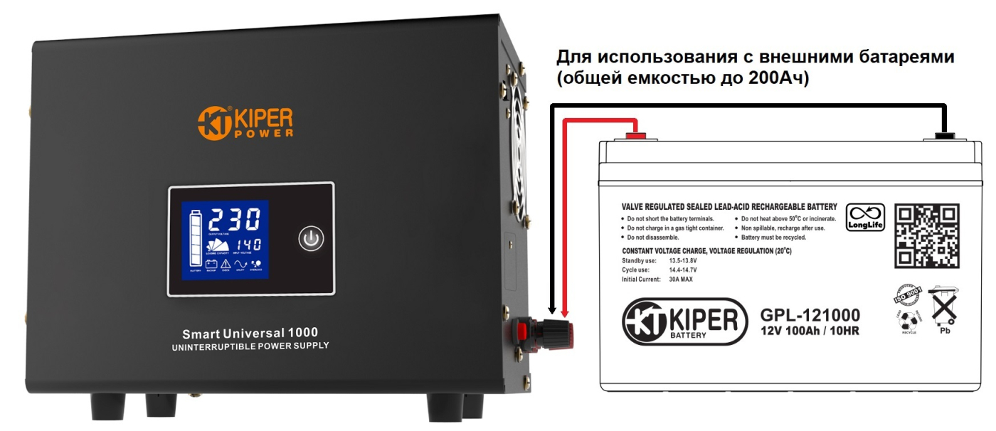 Чистая синусоида, без АКБ, подключается внешний аккумулятор 12В / 20-200Ач для длительного резервирования электропитания,