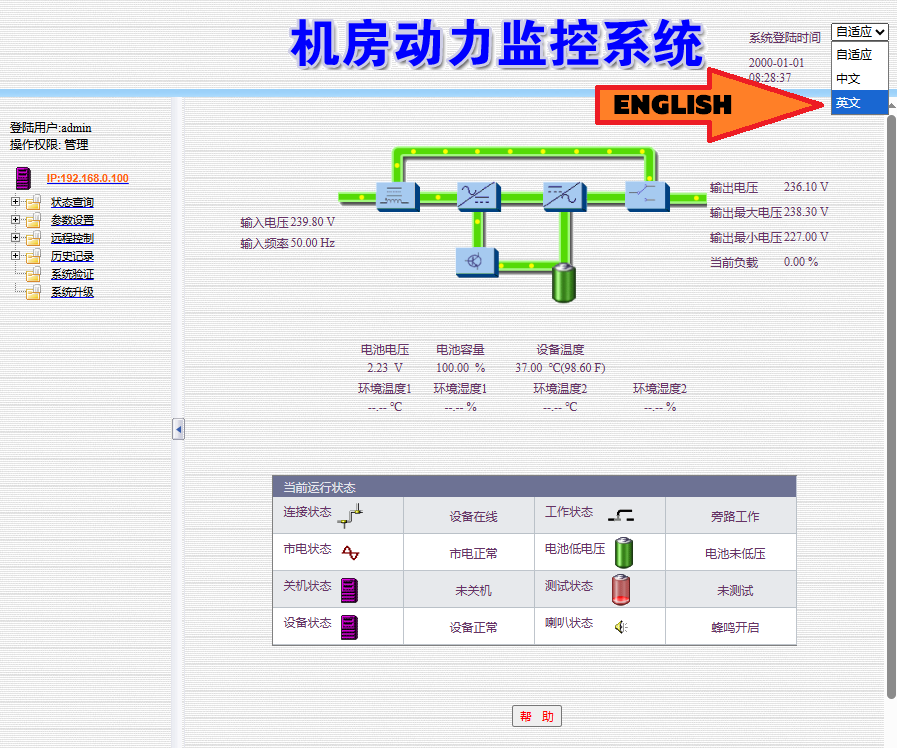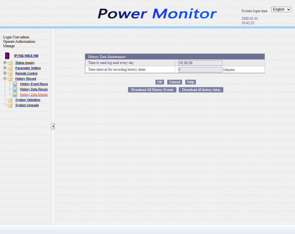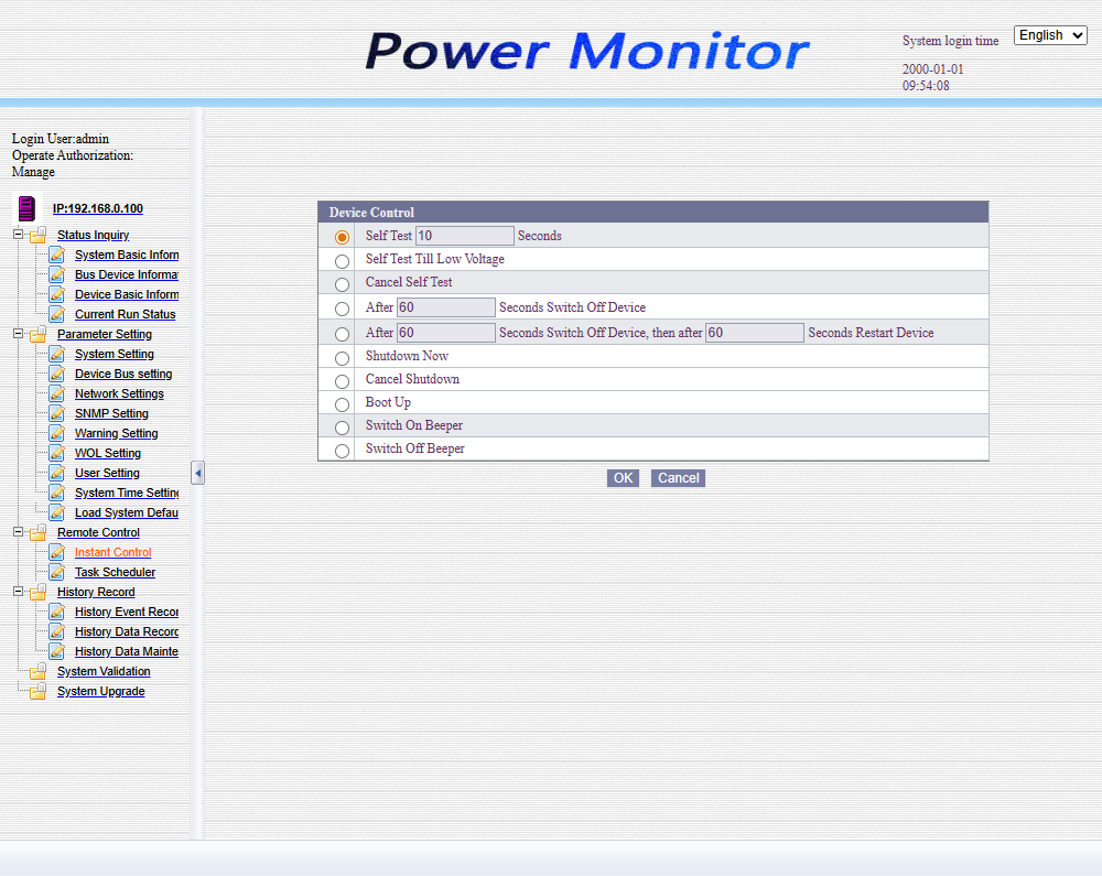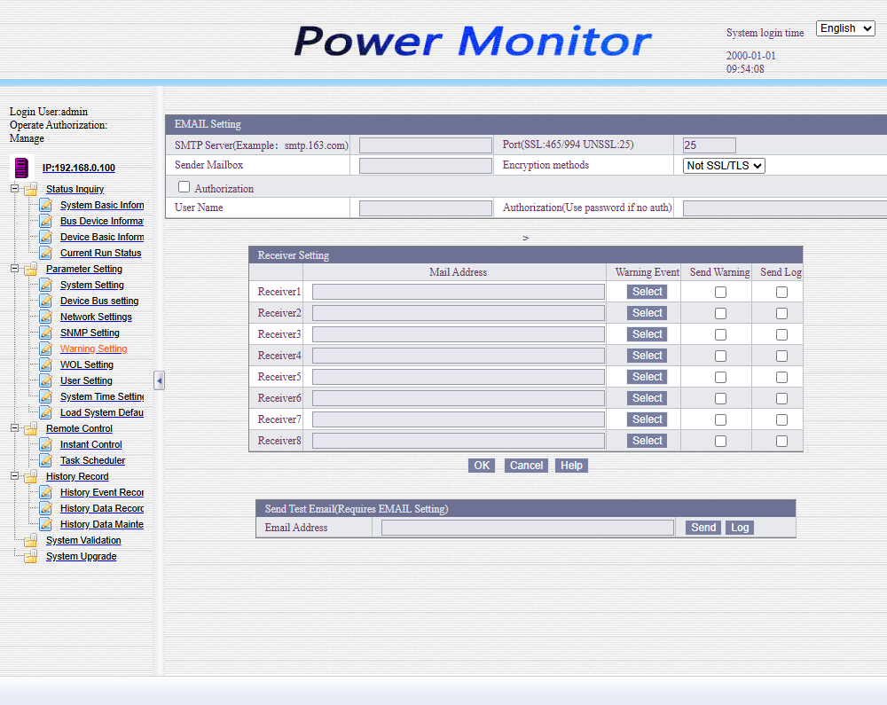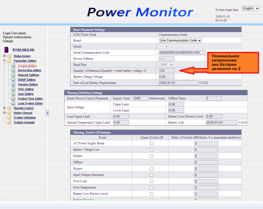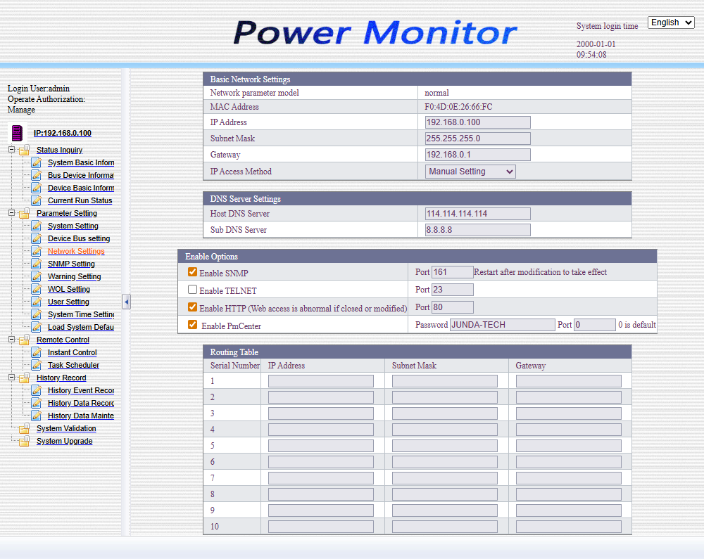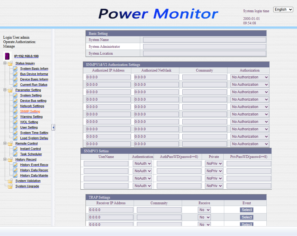 По умолчанию сетевой адрес SNMP карты статический: 192.168.0.100